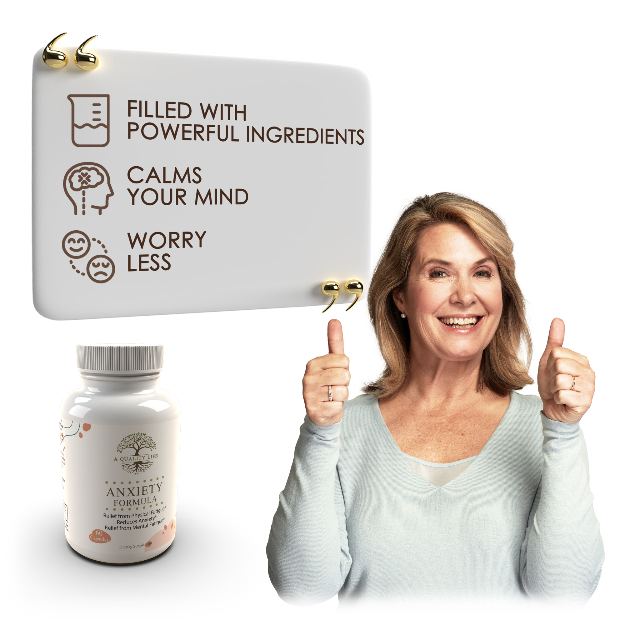Feeling stressed or anxious? Certainly, our Anxiety Formula is here to help. Made with natural ingredients, for instance, Ashwagandha and L-Theanine, A Quality Life Anxiety Formula is designed to calm your mind without making you sleepy. Importantly, we guarantee it is free of any drowsy formula.