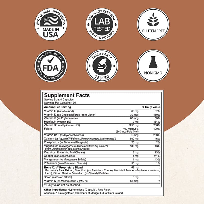 • Vitamin K2, Vitamin B12, Manganese, Potassium, and Boron, plus special ingredients like Vanadium and Eucommia Bark, ensuring a holistic approach to bone wellness.*